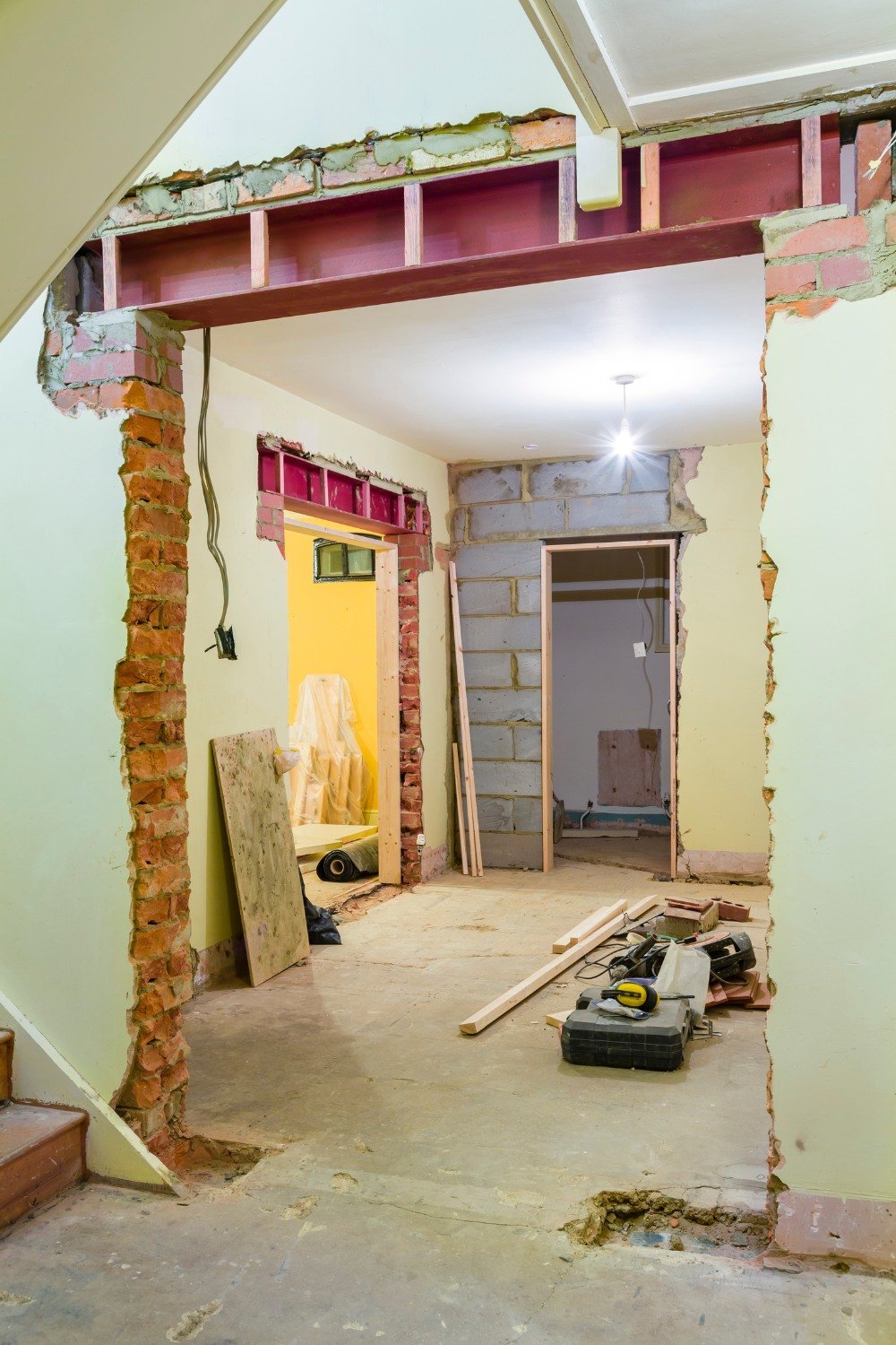 Installation : Nous installons la nouvelle poutre (en acier ou en bois lamellé-collé) et les colonnes pour transférer la charge vers les fondations.